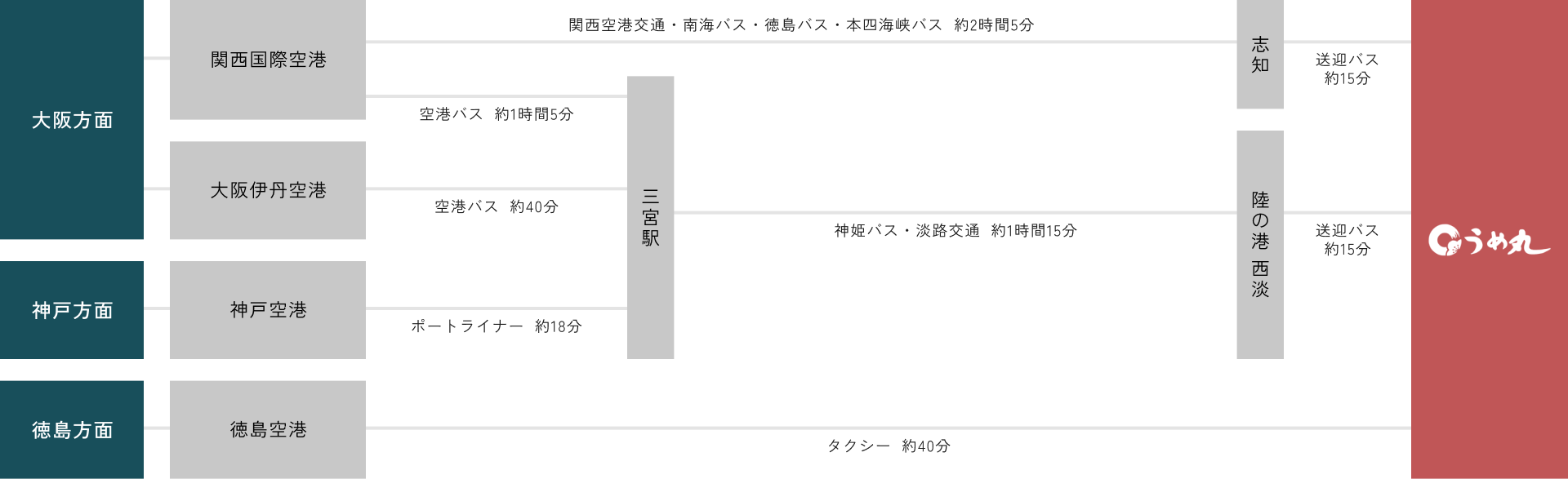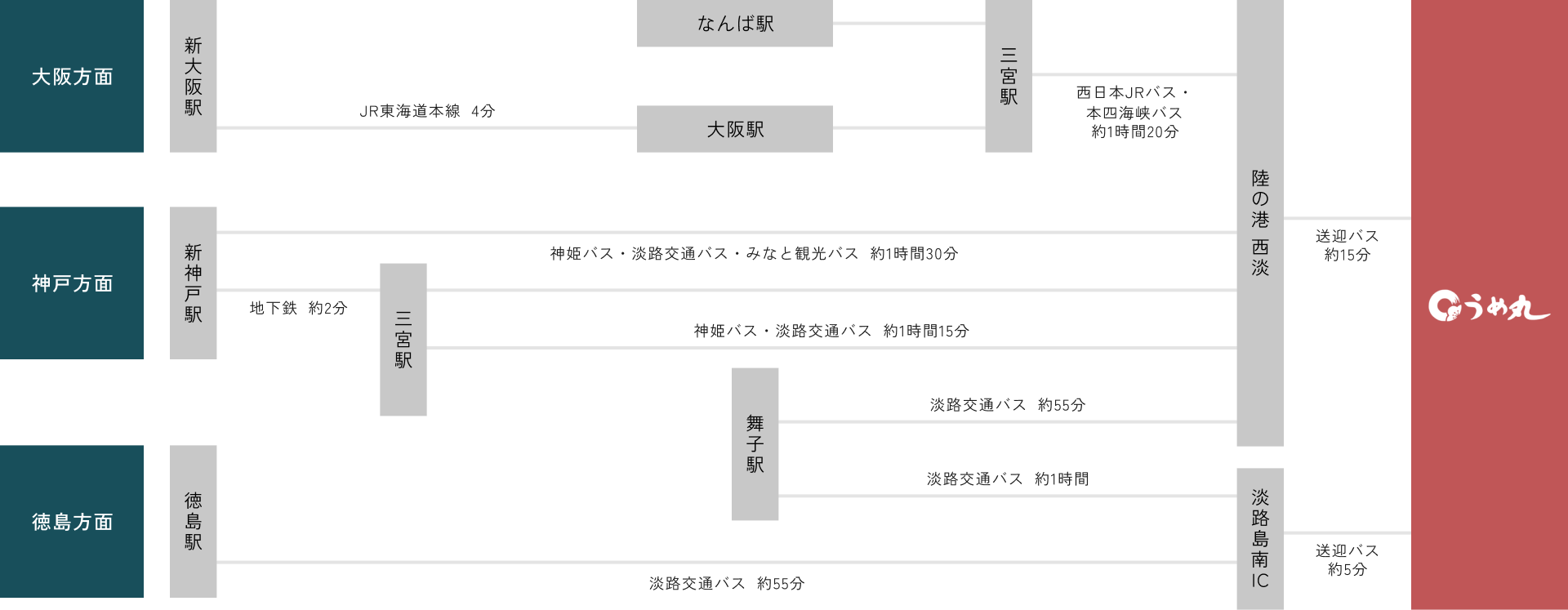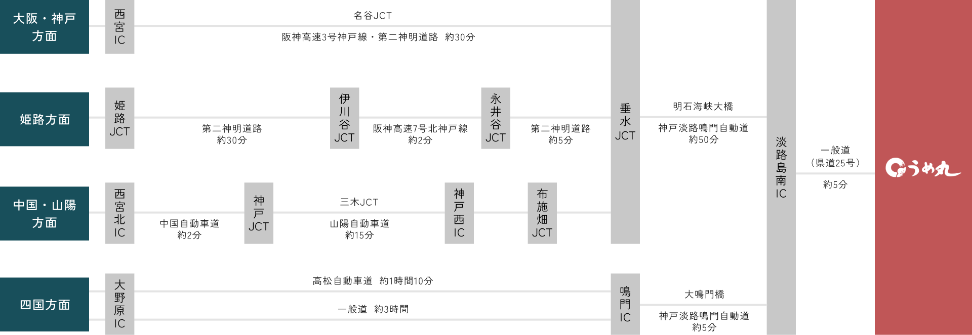 神戸淡路鳴門道の淡路島南インターから車でわずか5分、徳島空港からも車で30分程でお越しいただけます。