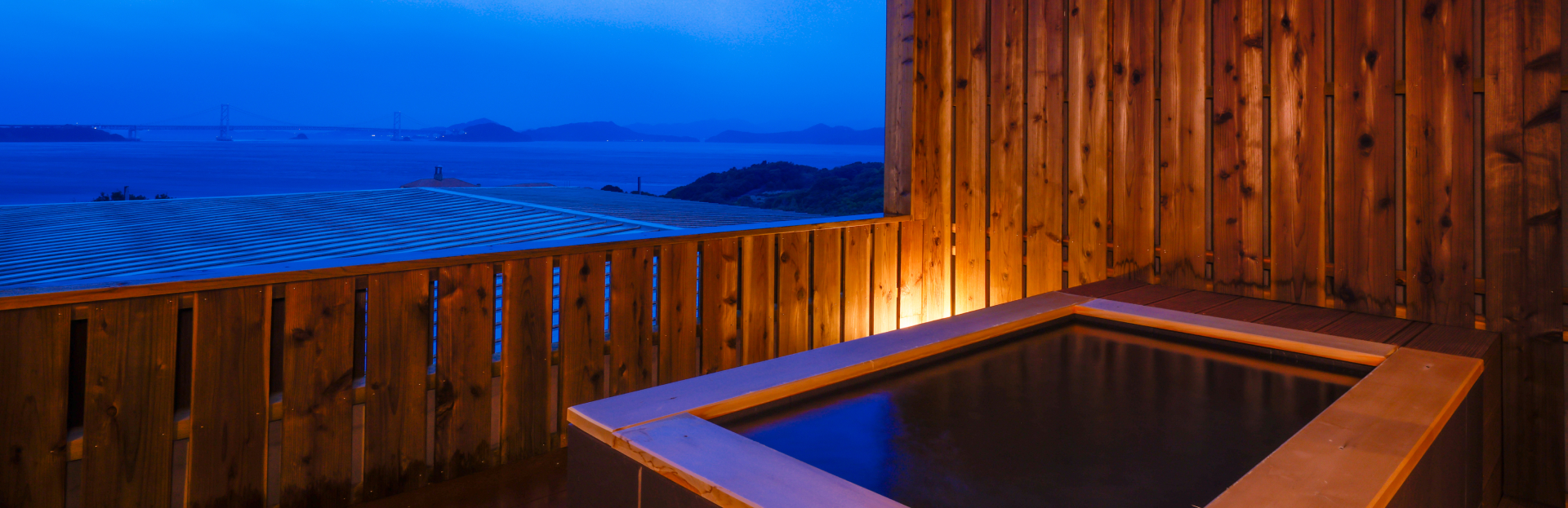 うめ丸では、贅沢な温泉体験をお楽しみいただける露天風呂付客室をご用意しております。誰にも邪魔されないプライベート空間で、鳴門海峡と大鳴門橋の美しい景色を眺めながら、うめ丸自慢の温泉を心ゆくまで堪能できる贅沢なお部屋です。